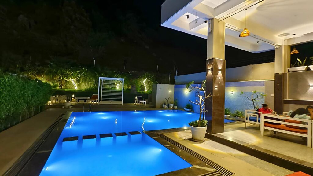 The Swimming Pool at Alwar Vanyaevilas Resort offers a perfect blend of luxury and relaxation. Surrounded by lush greenery and elegant architecture, it provides a serene escape where guests can unwind, take a refreshing dip, or simply lounge by the poolside gazebo. Whether it’s a sunny afternoon or a starlit evening, every moment spent here reflects the calm and royal charm of Alwar Vanyaevilas.